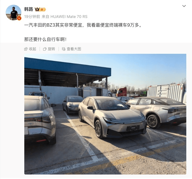 1月20日消息,據知名汽車博主韓路爆料,一汽豐田bZ3目前終端裸車只要9萬多。要知道,BZ3已經是豐體賣的最好的電動車了。