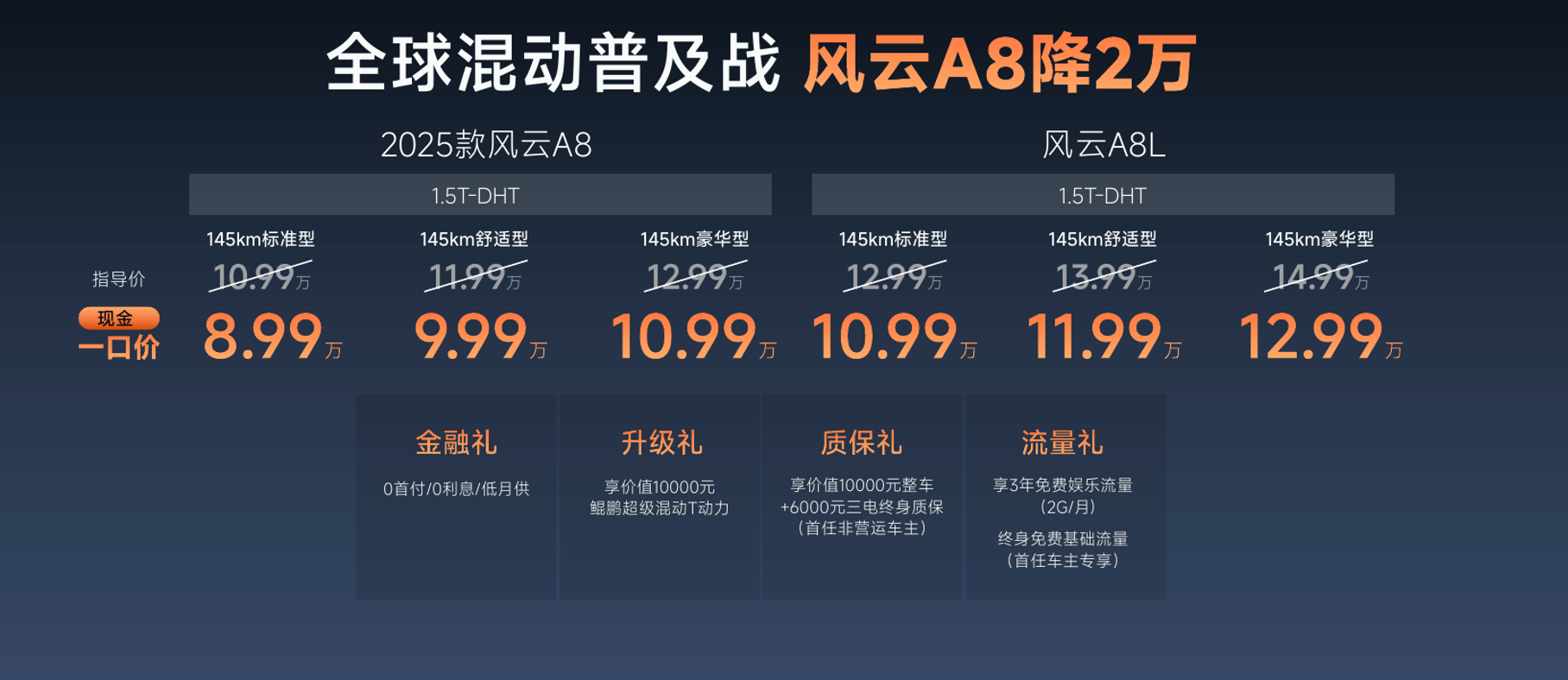2025款風(fēng)云A8煥新上市,現(xiàn)金一口價(jià)8.99萬(wàn)元起。