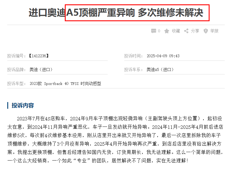 花50多萬買的奧迪S5,異響難根治,方向盤褶皺遭推諉,車主吐槽維權太難。