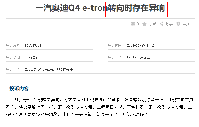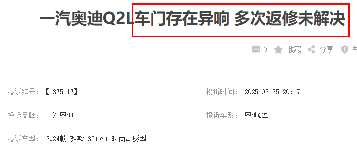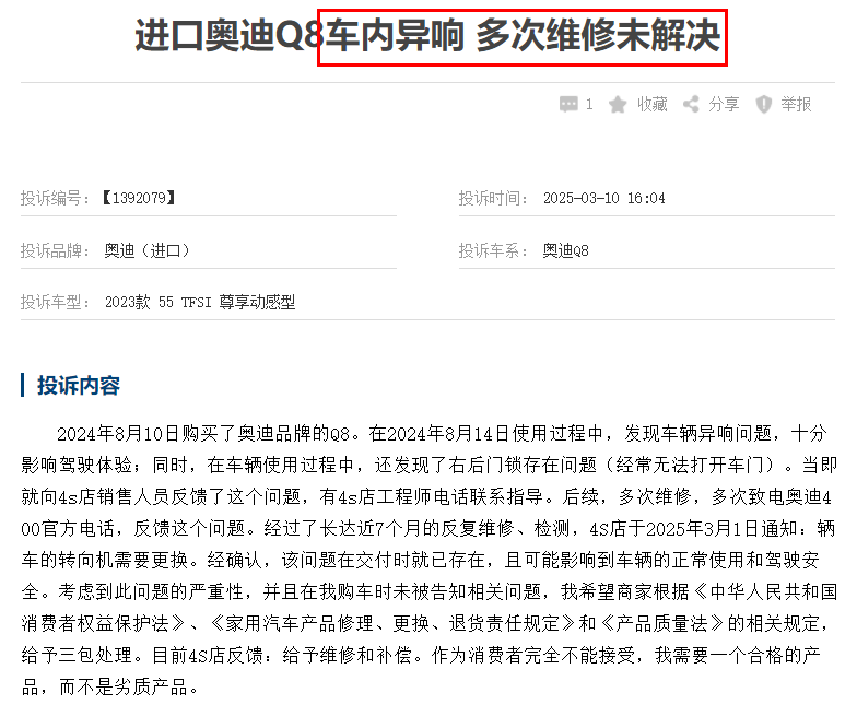 不過,回顧往期車主投訴,關于奧迪車輛異響的案例屢見不鮮。