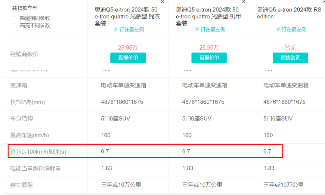 在加速性能方面,奧迪新能源車型表現平平,車輛性能、智能駕駛輔助、車機系統等方面也相對滯后。奧迪Q5 e-tron標準版百公里加速耗時長達9.3秒,高性能版本也需6.7秒,而特斯拉、小米SU7的高性能車型百公里加速時間可達到3秒左右,差距明顯。