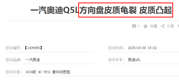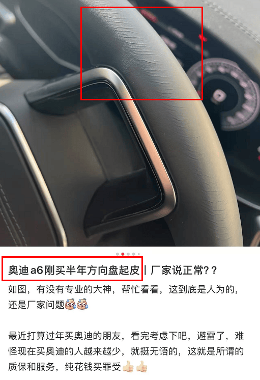 而關于方向盤皮質褶皺、龜裂的問題也常被車主爆出,最后多被4S店以"自然老化"、"車主使用不當"搪塞。