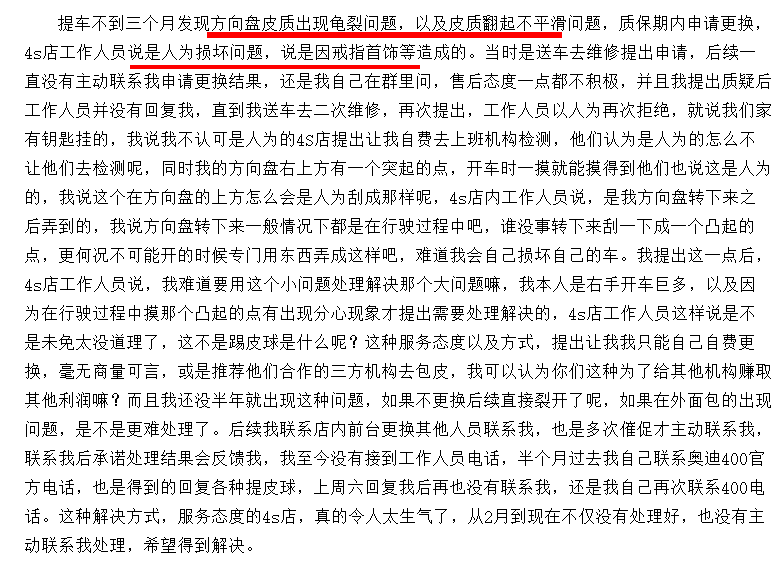 除此之外,提車就發現方向盤皮質存在明顯褶皺,4S店起初承諾索賠,后又改口稱索賠不了,可以維修修復,但至今仍未解決。