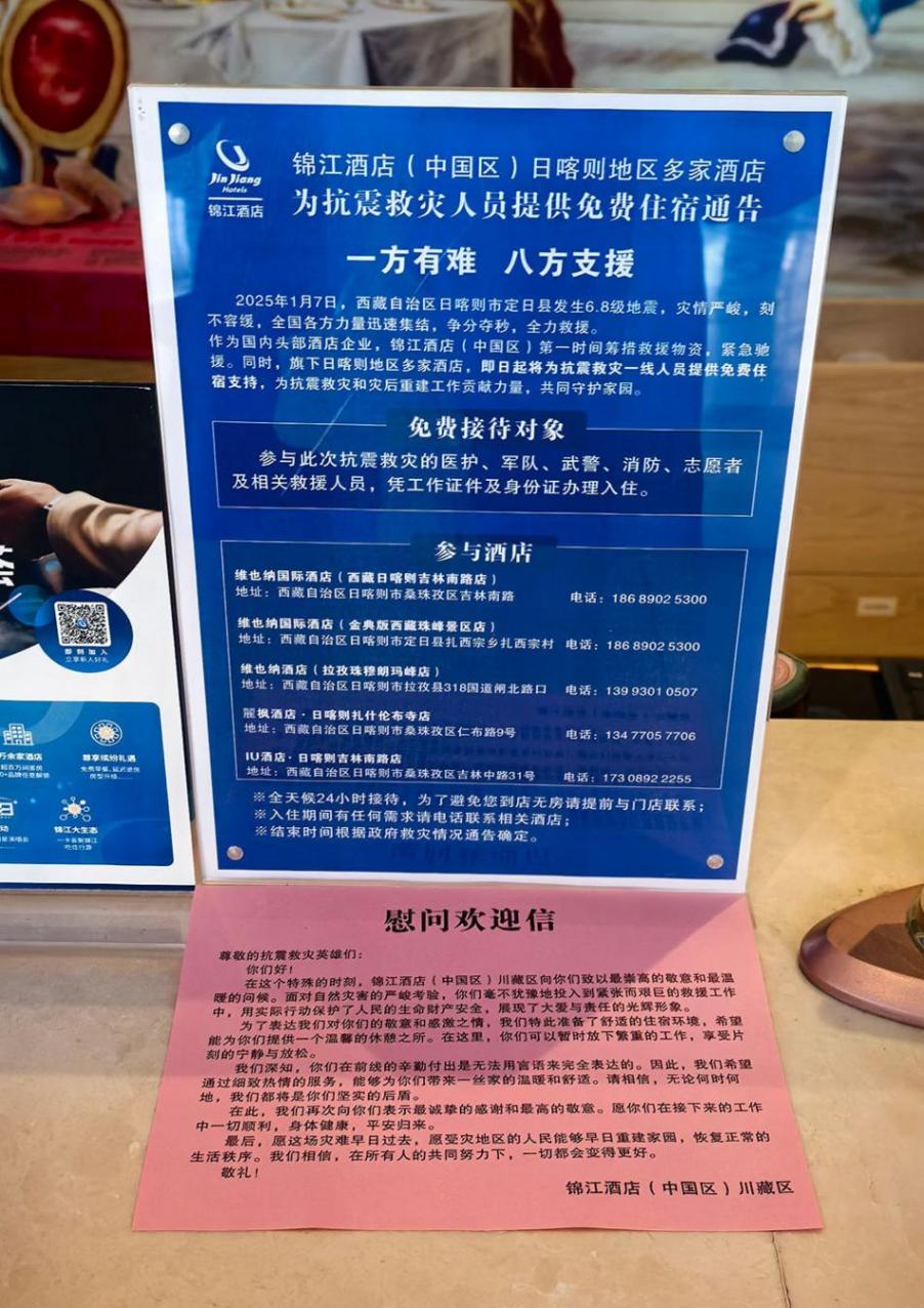 “到1月9日的時(shí)候,災(zāi)區(qū)救援物資的籌備已經(jīng)基本能滿足。10日的時(shí)候,用于受災(zāi)群眾安置的活動(dòng)板房已開始陸續(xù)安裝。”彭超稱,災(zāi)后,錦江酒店(中國區(qū))日喀則地區(qū)多家酒店為抗震救災(zāi)一線人員提供免費(fèi)住宿,共同守護(hù)家園。