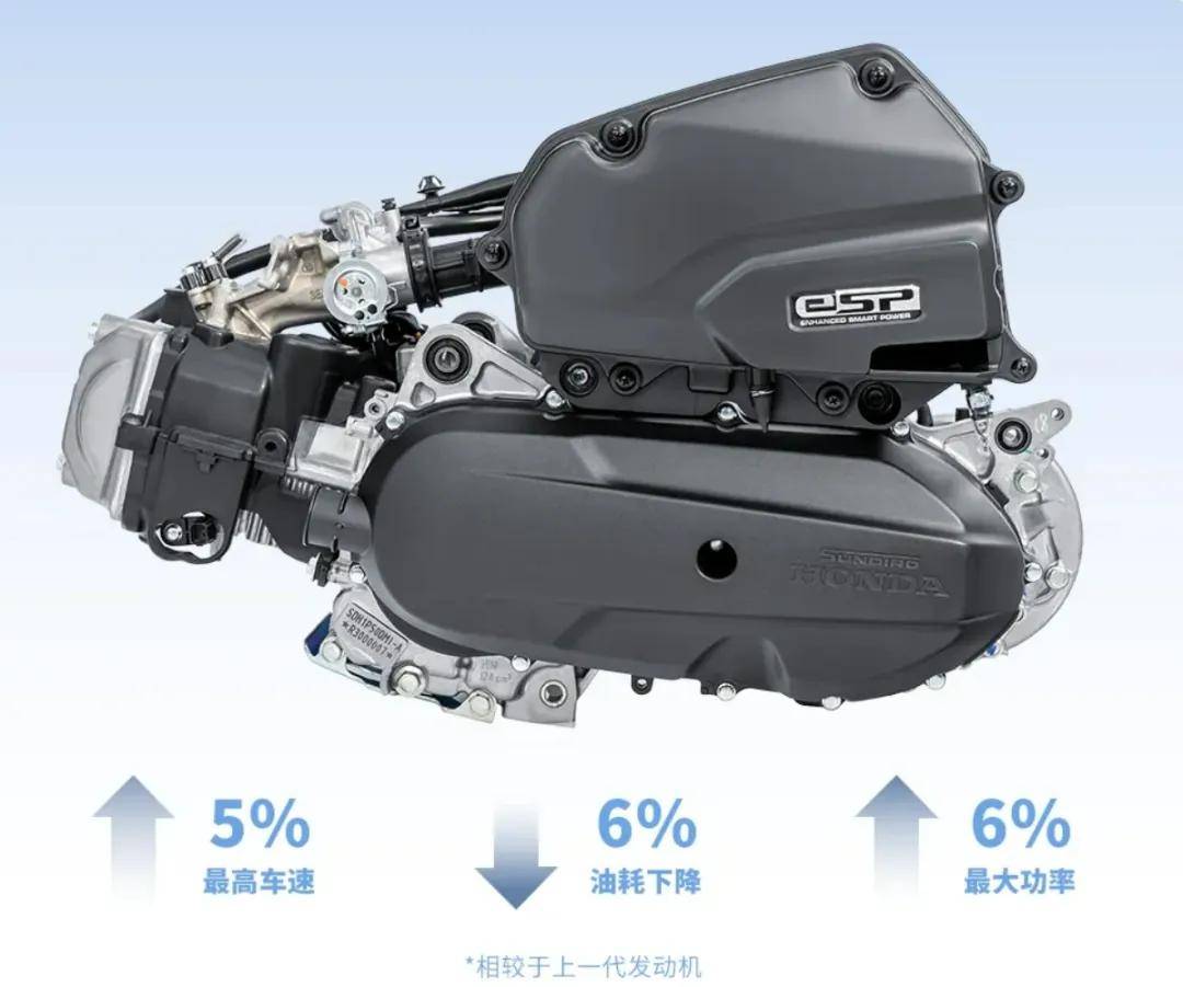 其中最大的升級來自動力系統,換裝了最新的eSP發動機,精確排量還是124cc,采用單缸四沖程的設計,但是壓縮比由9.8:1提升到了10:1,最大功率由6.6kW提升到了7kW,最大扭矩也從9.87N·m提升到了10N·m。動力提升的同時,油耗水平還更低了,由2024款車型的2.06L/100km降低到了1.9L/100km。官方表示,eSP發動機采用了可變渦流進氣技術,使燃燒更充分,最高車速得以提升5%,油耗得以降低6%。