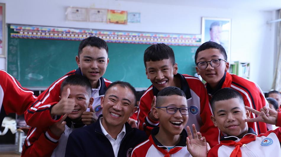 援藏過程中,汪海鯨(前排左二)與孩子們在教室