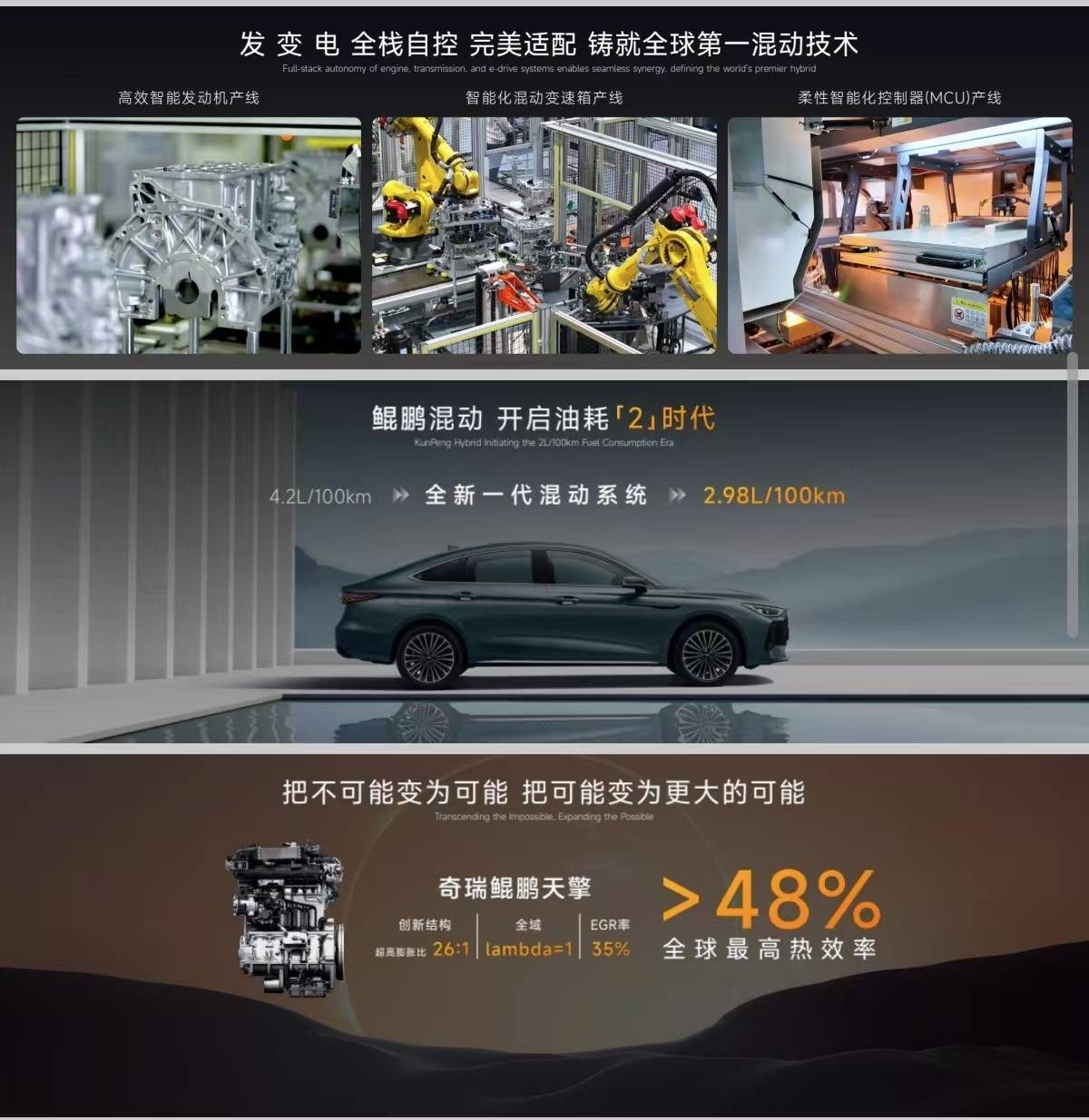 此外,奇瑞還揭曉了新一代鯤鵬天擎混動專用發動機,可實現 48% 以上的全球最高熱效率。