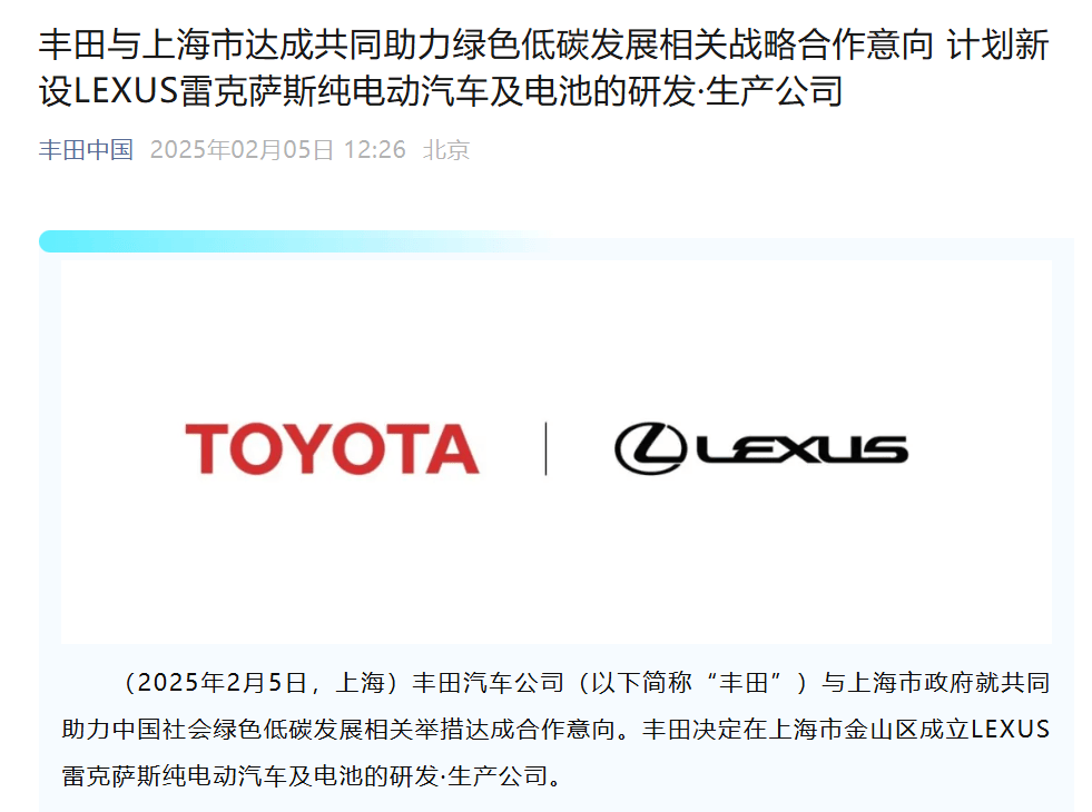 在事業布局上要更中國。今年2月,豐田中國正式官宣,將在上海市金山區獨資設立雷克薩斯純電動汽車及電池的研發和生產公司,計劃于2027年投產,年產能10萬輛。這標志著雷克薩斯將帶來更具競爭力、更加本土化的全新車系。